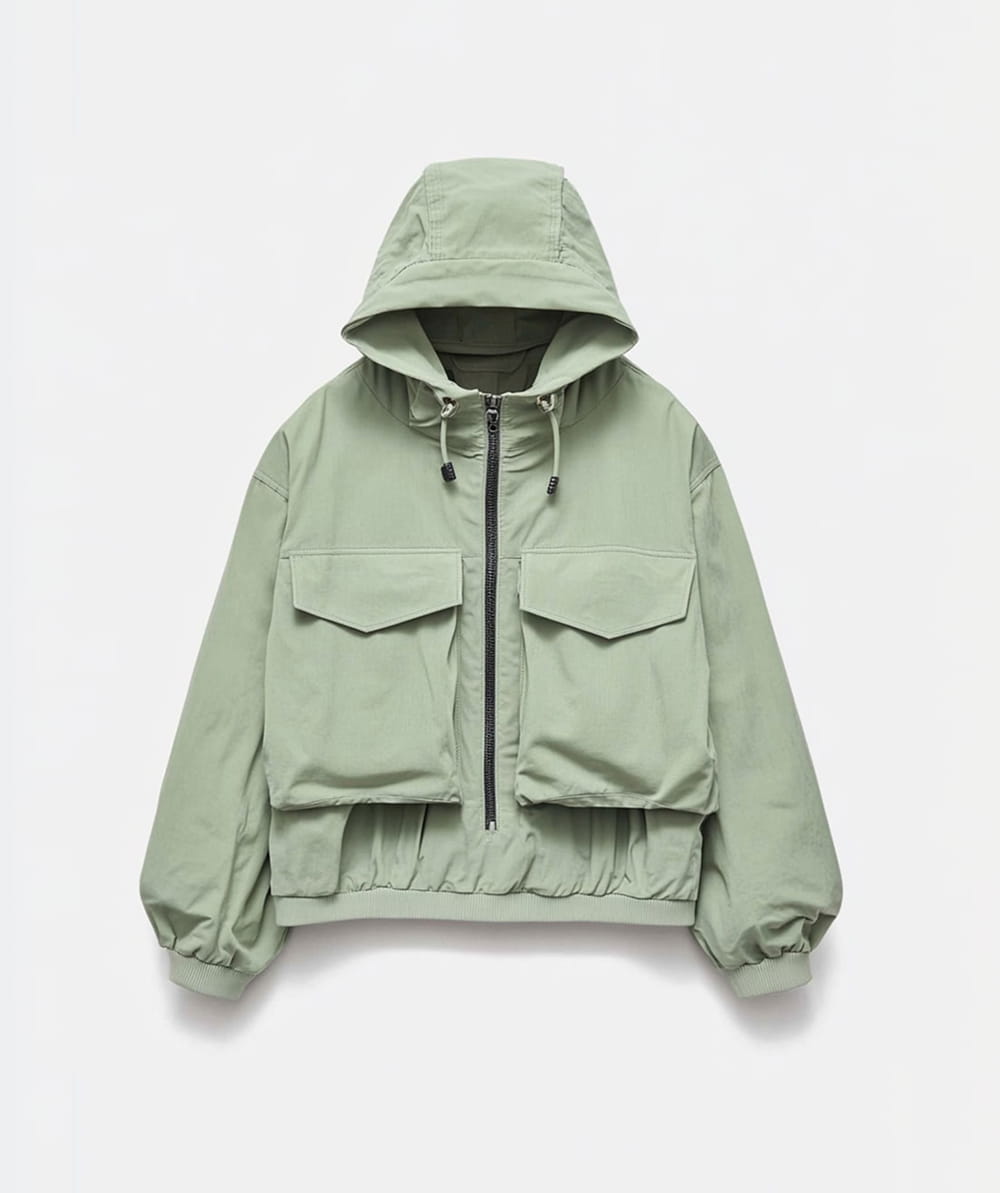 This cropped utility hoodie offers a contemporary blend of function and style. Featuring a zip-up front, oversized pockets, and an adjustable hood, it is perfect for layering in any season. The elasticized hem and cuffs create a structured yet relaxed silhouette for effortless wearability. Crafted from durable yet lightweight fabric, this piece ensures comfort without compromising on style. Ideal for casual outfits, streetwear looks, or layering over activewear.